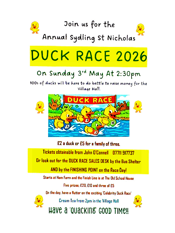 Each year hundreds of Sydling’s ducks are crammed into baskets and tipped en masse into the fast flowing Sydling Water. They are shouted at and poked with a long pole! The race commentator and energetic young runners keep the hopeful punters updated on the progress of the race. Some ducks get stuck in dense water weed, others upend with their tails in the air but the strongest finish the course. The losers are unceremoniously scooped up and thrown back into baskets until next year!